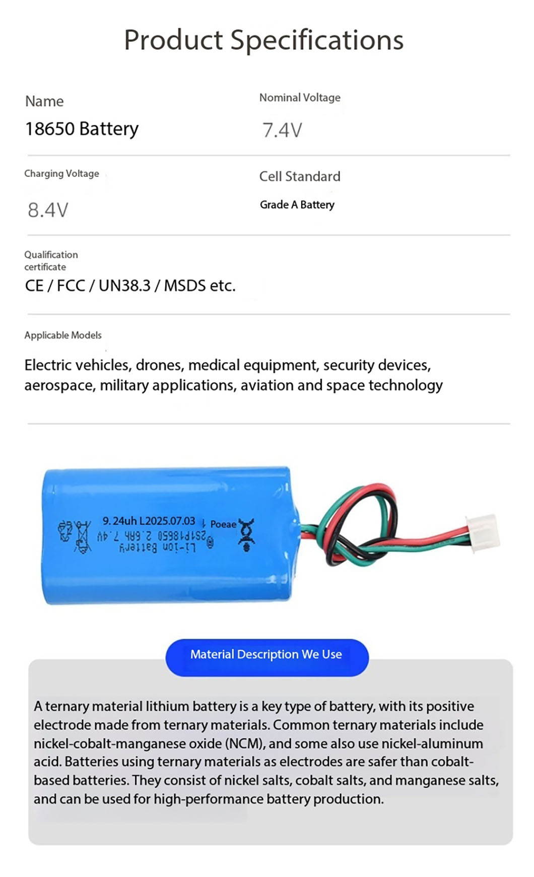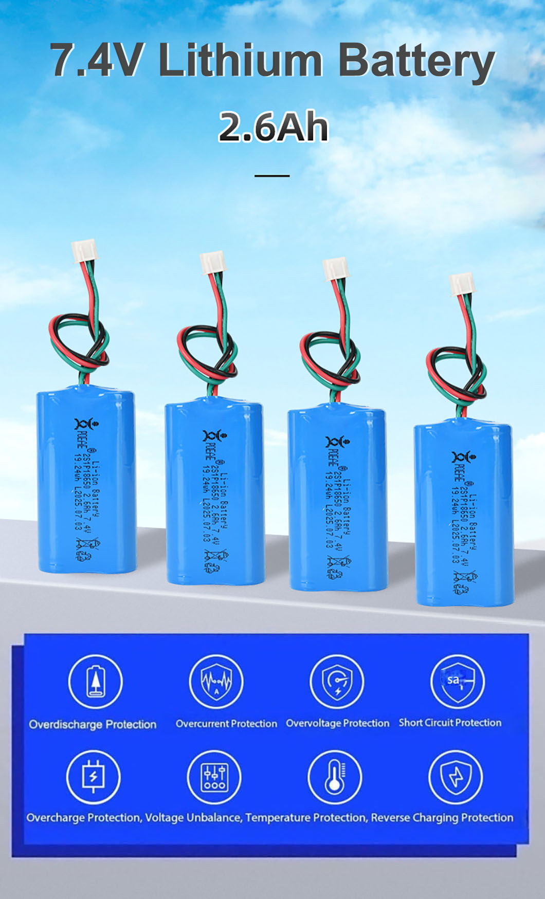 2.6Ah 7.4V Lithium Battery with Protection Board and Lead for Strong Light Flashlight Water Gun Remote Control Car Toy
